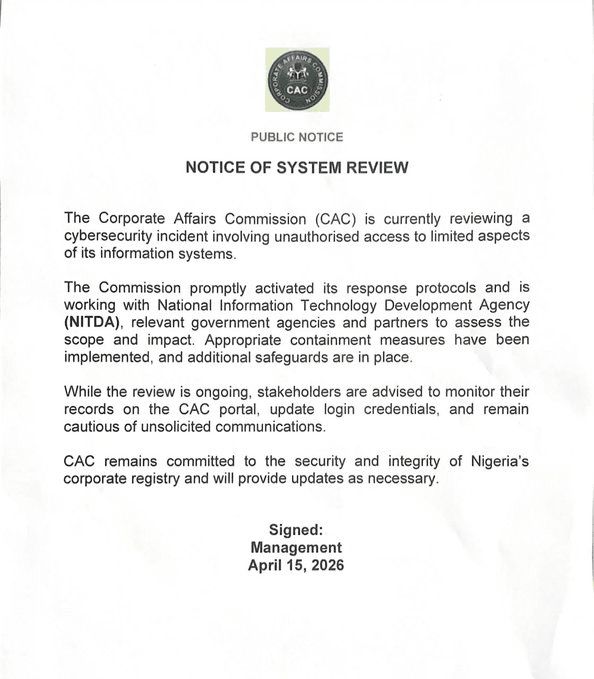 As investigations continue, the commission has urged stakeholders to regularly check their records on the CAC portal, update their login details, and stay alert to any unsolicited messages that may be connected to the incident.
