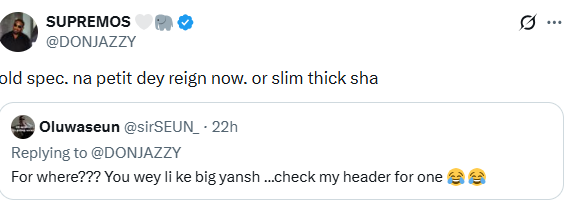 When a fan on X told him he likes “big yansh” (buttocks), he tweeted, “Old spec. Na petit dey reign now. Or slim thick sha.”