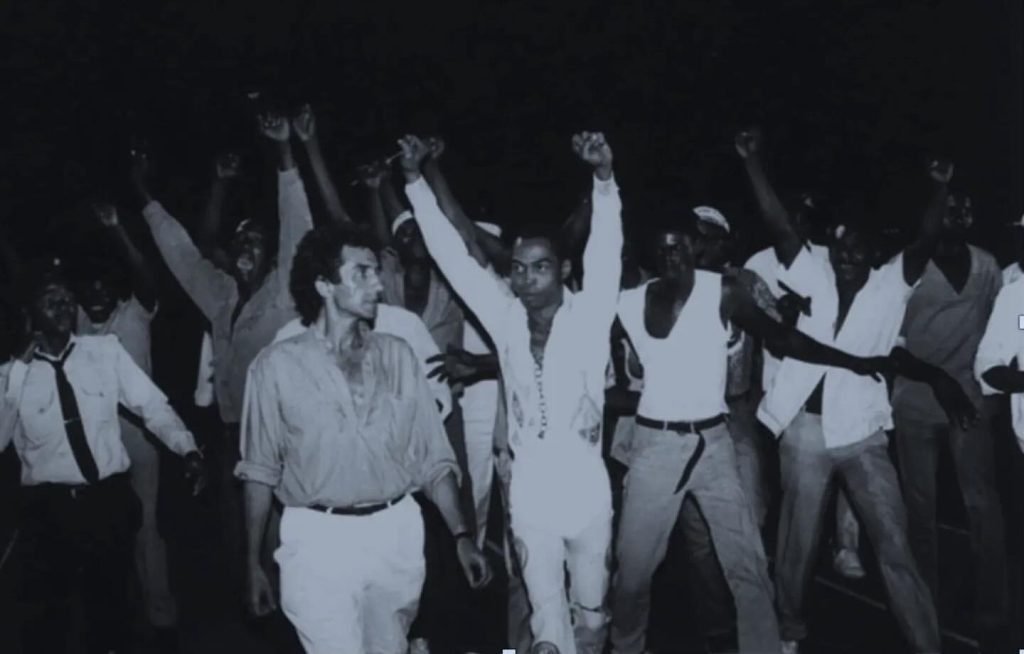 Fela Kuti with manager, Rikki Stein, in 1986, celebrating his release from prison Credit: Afrobeating