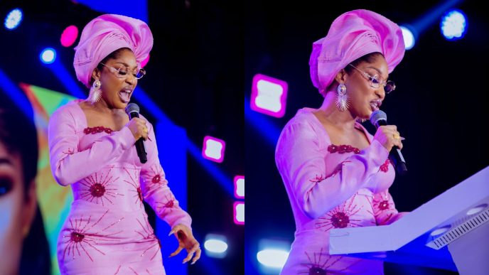 Toyin Abraham’s look is elegance with a bold architectural edge, giving off a regal and commanding presence.