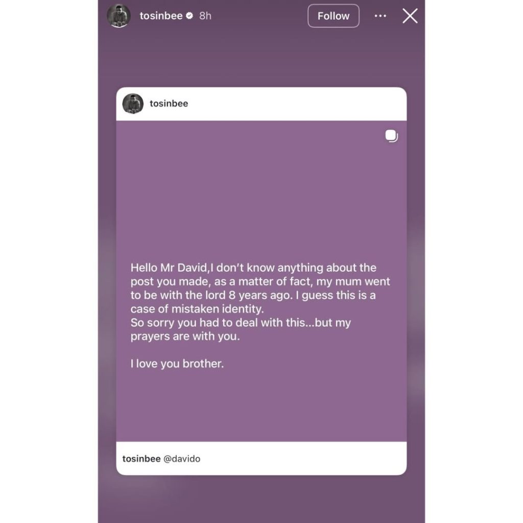 However, just before Davido posted his final tweet on X clarifying for fans what really transpired, he called out gospel singer Adejumobi Oluwatosin, popularly known as Tosin Bee, on his Instagram story just after his attack on the lawyer.
