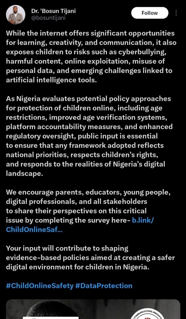 “While the internet offers significant opportunities for learning, creativity and communication, it also exposes children to risks such as cyberbullying, harmful content, online exploitation, misuse of personal data and emerging challenges linked to artificial intelligence tools,” Tijani wrote.