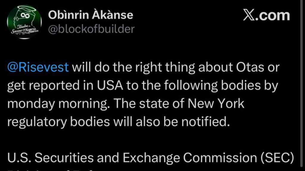 Some users, like @blockofbuilder, are already threatening to report the matter to U.S. regulators (SEC, FINRA, FTC) if the company doesn’t “do the right thing,” because Risevest has U.S. operations and she is based there.