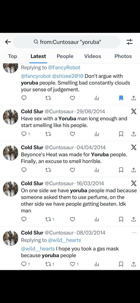 At the time Evbuomwan posted those destructive tweets, she was a regular user under the handle @Cuntosaur. She made a string of unfiltered, venomous posts targeting Yoruba women.