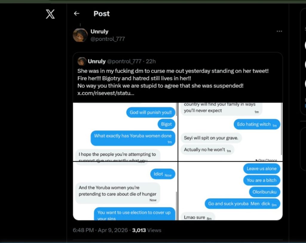 On April 8, 2026, an X user (@pontrol_777) shared new screenshots that allegedly showed Evbuomwan messaging them privately. She was defending her old posts and using similar offensive language again. This made the issue feel current instead of like something from the past. As usual, people quickly got angry, especially many Yoruba users, who felt the posts were unnecessary and showed ongoing bias.