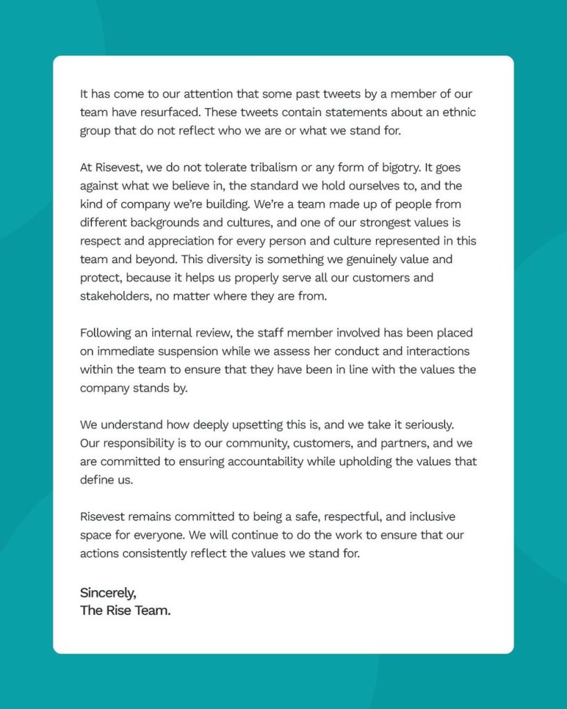 Now, her career is hanging by a thread. Although the company is in full damage-control mode, Nigeria’s already sensitive tribal tensions have flared up like a Lagos traffic jam during rush hour. It was made clear that Risevest is meant to be a workplace built on respect and inclusion, with zero tolerance for tribalism or any form of bigotry.