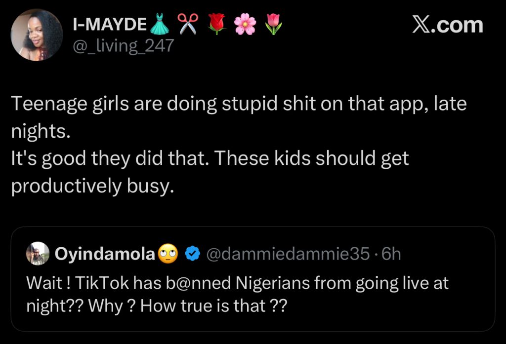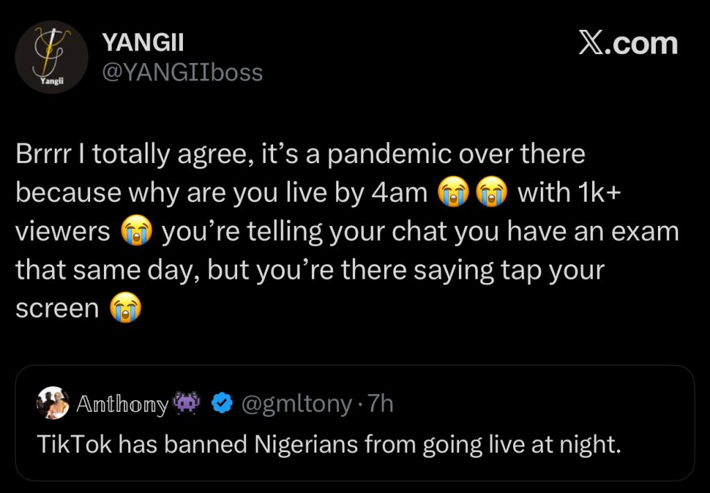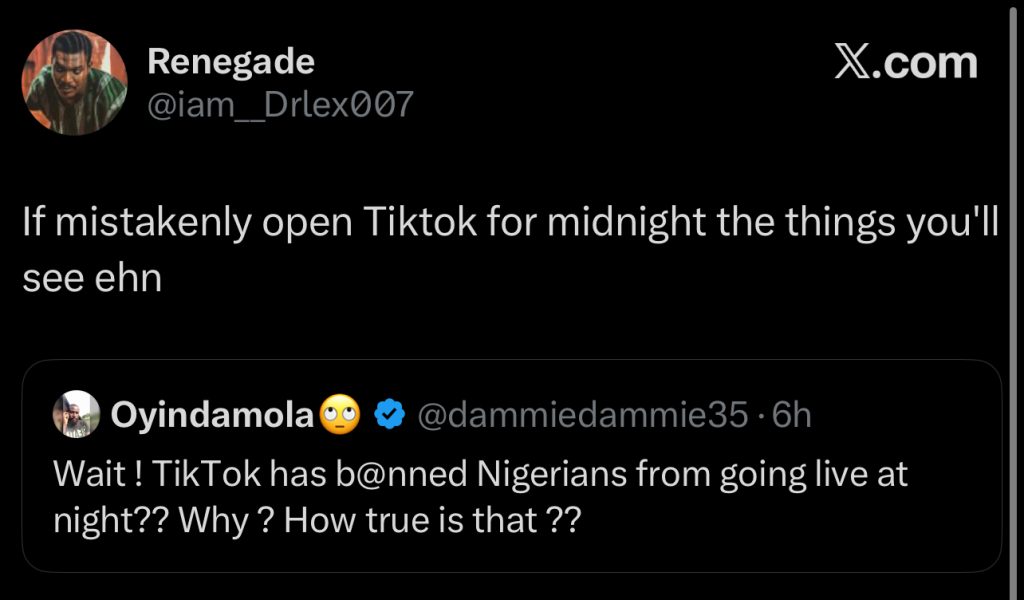“Why TikTok go ban LIVE at night for Nigeria? They don collect atije atimu for our hand.”