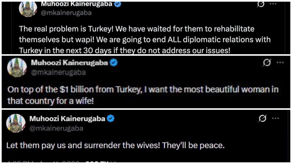 Muhoozi Kainerugaba, the military boss, hopped on X, threatening to remove Turkey’s embassy from Uganda. He said that if they don’t cough up $1 billion and hand over “the most beautiful woman in Turkey” as his wife within 30 days, he will close it.